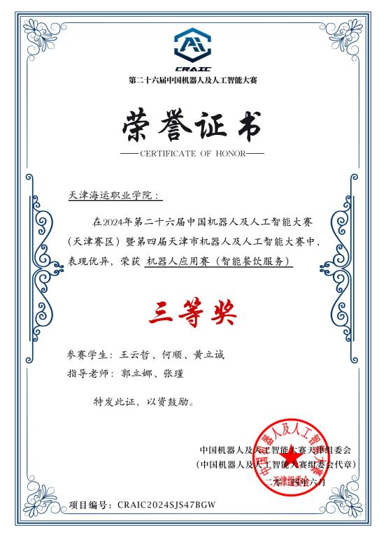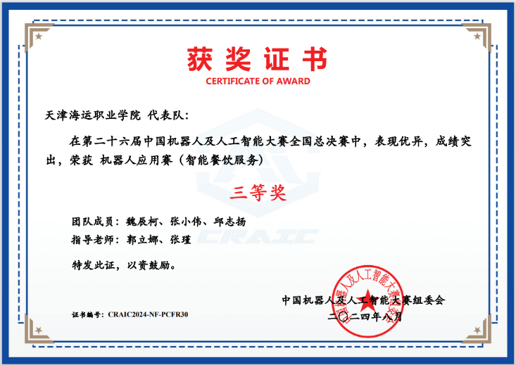 日前,中国机器人及人工智能大赛机器人应用赛(智能餐饮服务)赛项圆满落幕。大赛已列入中国高等教育学会发布的全国普通高等学校学科竞赛排行榜、全国普通高校大学生竞赛分析报告,天津海运职业学院信息工程系选派的海运智能队、YSK参加比赛并取得优异成绩。